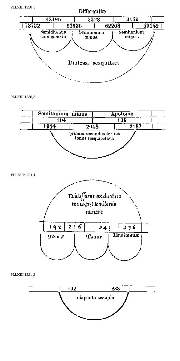 [PLLXIII:1221,1; text: Diatessaron ex duobus tonis et Hemitonio minore, 192, 216, 243, 256, Tonus, Hemitonius]