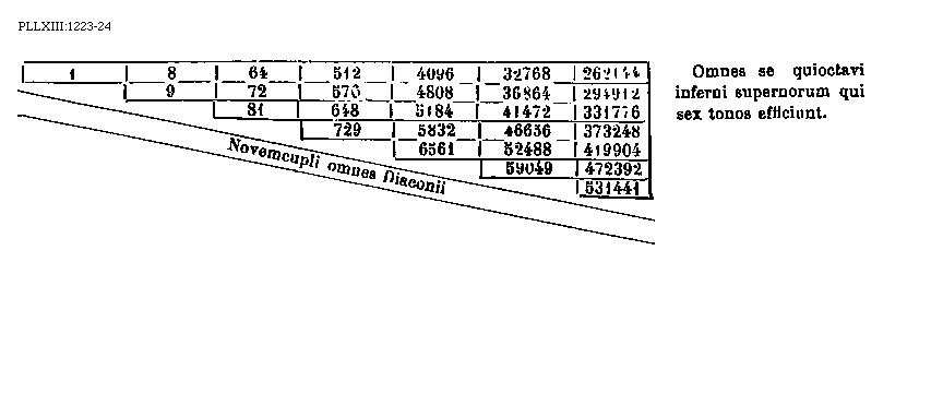 [1223-24][PLLXIII:1223-24; text: 1, 8, 64, 512, 4096, 32768, 262144, 9, 72, 576, 4808, 36864, 294912, 81, 648, 5184, 41472, 331776, 729, 5832, 46656, 373248, 6561, 52488, 419904, 59049, 472392, 531441, Omnes se quioctavi inferni supernorum qui sex tonos efficiunt. Novemcupli omnes Diaconii]