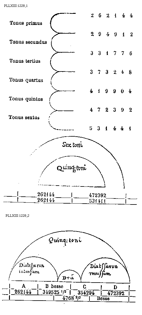 Quod si (ut ait Aristoxenus) diatessaron consonantia ex duobus tonis semitonioque conjungitur, duae diatessaron consonantiae necessario quinque tonos efficient, et diapente ac diatessaron junctae, sicut unum diapason jungunt, ita sex tonis continua proportione coaequantur. Et quoniam paulo ante sex disposuimus tonos, quorum minimus erat numerus 262144, ad hunc vero ultimus in sexto collocabatur tono numerus 531441, quintum vero retinebant tounm 472392, disponantur hoc modo: