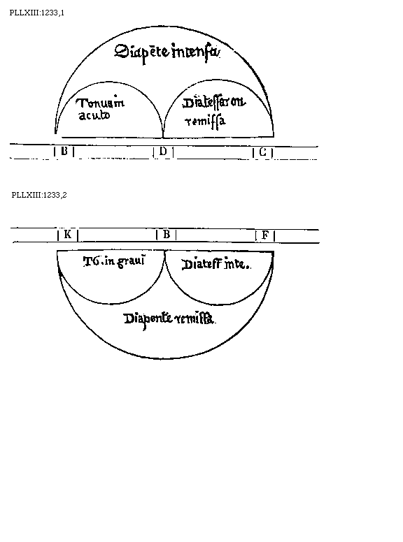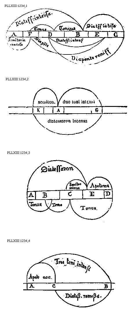 [PLLXIII:1234,4; text: Tres toni intensi, Apotome acuta, A, C, B, Diatessaron remissa.]