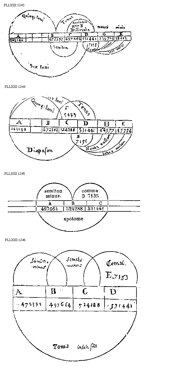 [PLLXIII:1246; text: Semitonium minus, Coma, E, 7153, A, 472392, B, 497664, C, 52488, D, 531441, Tonus intensus]