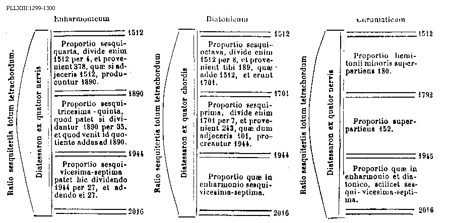[1299][PLLXIII:1299-1300; text: Enharmonicum, Ratio sesquitertia totum tetrachordum. Diatessaron ex quatuor nervis, Proportio sesquiquarta, divide enim 1512 per 4, et provenient 378, quae si adjeceris 1512, producuntur 1890. Proportio sesquitricesima-quinta, quod patet si dividantur 1890 per 35, et quod venit id quotiente addas ad 1890. Proportio sesquivicesima-septima patet hic dividendo 1944 per 27, et addendo ei 27. 2016, Diatonicum, Diatessaron ex quatuor chordis, Proportio sesquioctava, divide enim 1512 per 8, et provenient tibi 189, quae adde 1512, et erunt 1701. Proportio sesquiprima, divide enim 1701 per 7, et provenient 243, quae dum adjeceris 101, procreantur 1944. Proportio quae in enharmonio sesquivicesima-septima. Chromaticum, Proportio hemitonii minoris superpartiens 180. Proportio superpartiens 152. Proportio quae in enharmonio et diatonico, scilicet sesqui-vicesima-septima. 1792, 1945]