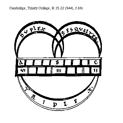 [Cambridge, Trinity College, R.15.22 (944), f.69r; text: Triplex, A, B, C, VI, III, II, Duplex, Sesqualter]