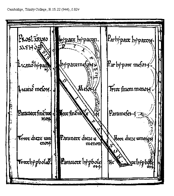 [f.83r][Cambridge, Trinity College, R.15.22 (944), f.83r; text: A, B, C, D, E, F, G, H, I, K, L, M, N, O, P, Q, R, S, T, V, X, Y, Z, BB, CC, DD, EE, FF, GG, HH, KK, LL, Tonus, Semitonium, Diesis, Tetracordum hypaton, Tetracordum meson, Tetracordum sinemmenon, Tetracordum hyperboleon, Diatessaron, Tetracordum diezeumenon, Diapason, Bisdiapason, ENARMONICVM, Proslambanomenos, VIIII[macron supra lin.]CCXVI. Hypatehypaton, VIII[macron supra lin.].CXCII. Parhypatehypaton, VII[macron supra lin.].DCCCCLXXXIIII. Lycanoshypaton, VII[macron supra lin.]DCCLXXVI. Hypatemeson, VII[macron supra lin.]CXLIIII. Parhypatemeson, V[macron supra lin.]DCCCCLXXXIIII. Lycanosmeson enarmonios, V[macron supra lin.].DCCXXXII. MESE, IIII[macron supra lin.].VIII. IIII[macron supra lin.].DCVIII. Trite sinemmenon, IIII[macron supra lin.].CCCCXCII. Paramese, IIII[macron supra lin.].CCVI. Paranete sinemmenon, IIII[macron supra lin.].CCCLXXIIII. Trite diezeumenon, IIII[macron supra lin.].DCCCCXCII. Nete sinemmenon, III[macron supra lin.].CCCCLVI. Paranete diezeumenon, III[macron supra lin.].DCCCLXXXVIII. Nete diezeumenon, IIII[macron supra lin.].LXXII. III[macron supra lin.].LXXII. Trite hyperboleon, II[macron supra lin.].DCCCCXCIIII. Paranete hyperboleon enarmonios, II[macron supra lin.].DCCCCXVI. Nete hyperboleon, II[macron supra lin.].CCCIIII. CROMATICVM, IX[macron supra lin.].CCXVI. VI[macron supra lin.].DCCLXXVI. Licanoshypaton cromatice, VI[macron supra lin.]XCVI. VI[macron supra lin.].CXLIIII. V[macron supra lin.].DCCCXXXII. Lichanosmeson, V[macron supra lin.].CCCCLXXII. IIII[macron supra lin.]. Paranete synemmenon cromatice, IIII[macron supra lin.].IIII. III[macron supra lin.].DCCCCLXXXVIII. III[macron supra lin.].DCXLVIII. Paranete hyperboleon cromatice, II[macron supra lin.].DCCXXVI. DIATONICVM, VI[macron supra lin.].DCCCCXII. Licanosmeson diatonos, V[macron supra lin.].CLXXXIIII. IIII[macron supra lin.].XCVI. Paranete hyperboleon, II[macron supra lin.].DXCII.]