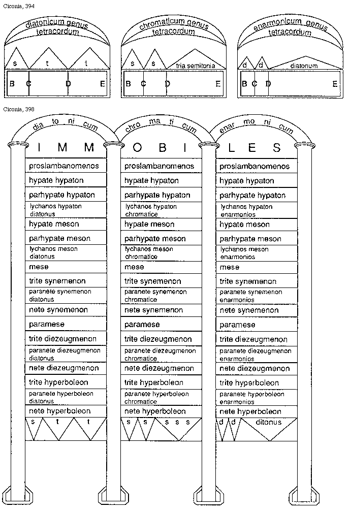 Boetius: His igitur expeditis, dicendum est de generibus melorum. Sunt autem tria: diatonum, chroma, enarmonicum. Et diatonum quidem aliquanto durius et naturalius est. Chroma vero iam quasi ab illa naturali intentione discedens et in mollius decidens. Enarmonicum vero optime atque apte coniunctum est. Cum sint igitur quinque tetracorda: hypaton, meson, synemenon, diezeugmenon, hyperboleon. In his omnibus secundum diatonum
