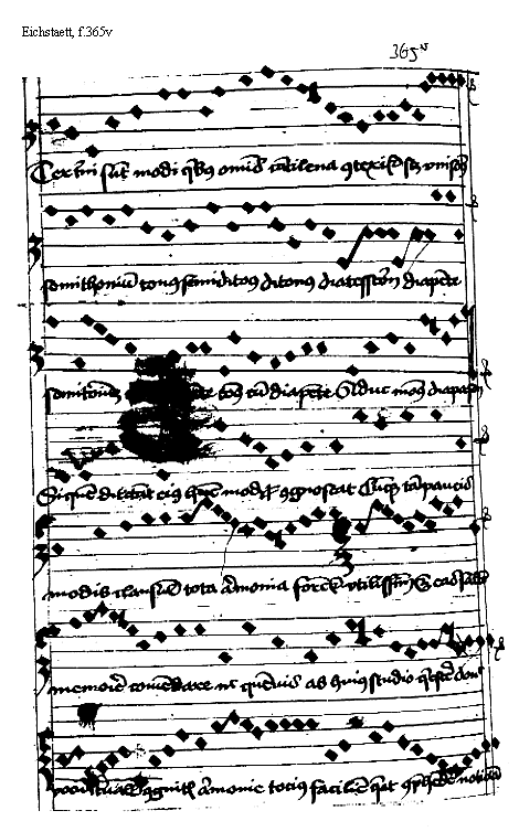 [f.365v][Eichstaett, f.365v; text: Ter terni sunt modi quibus omnis cantilena contexitur scilicet unisonus semithonium tonus semiditonus ditonus diatesseron diapente semitonium cum diapente tonus cum diapente Aduc modus diapason Si quem dilectant eius hunc modum esse cognoscat Cumque tam paucis modis clausulum tota armonia formetur vtilissime est eadem saltem memorie tocius dare ne quemuis ab huius studio quiescere donec vocum intervallis cognitis armonie tocius facilime queat comprehendere noticia]