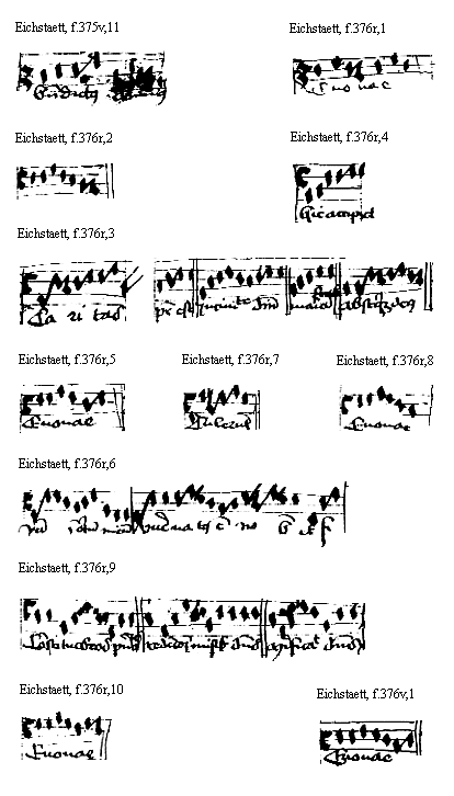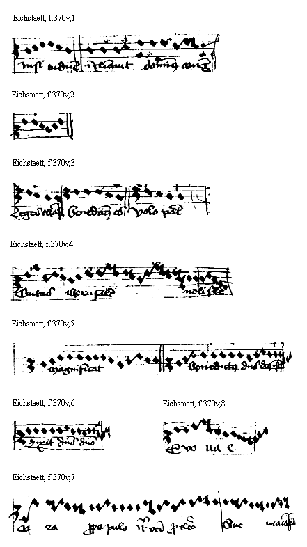 Et in pluribus alijs responsorijs et offertorijs hoc solet euenire Et huius toni tantum vna est differencia Scilicet ista [Eichstaett, f.375v,10; text: Euouae]