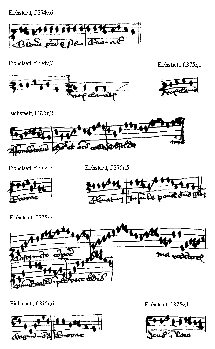 [Eichstaett, f.375v,6; text: Estote parati, Ipse inuocat me, Gaudeamus omnes fideles, Puer Ihesus, Sancta et immaculata virginitas, O admirabile commercium, Exiui a patre meo, Veni dilecta mea, Gloriosi principes]