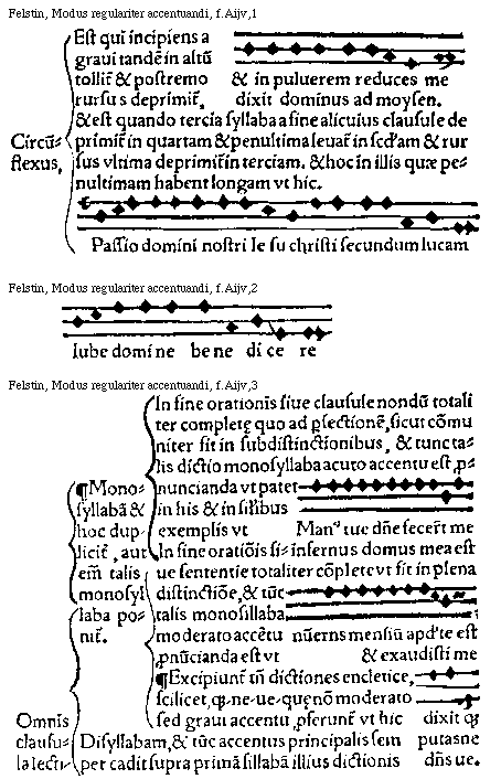 [f.Aijr][Felstin, Modus regulariter accentuandi, f.Aijr; text: Accentus est quadruplex. Grauis Est qui tantum deprimitur, et non eleuatur. Et causatur dupliciter. Primo quando fit depressio syllabe ab accentu predominante in terciam, vt fit in subdistinctione, et hoc tantum in bissyllabis et pollisyllabis, in dissyllabis semper secunda deprimitur vt hic, dicit deus vester. In pollisyllabis vero habentibus penultimam longam vltima deprimitur. deum amate. In habentibus autem penultimam breuem eadem penultima deprimitur, vt hic, dicit dominus. Secundo quando fit saltus a syllaba super quam cadit predominans accentus in quintam et hoc tam in longa quam in breui, Exemplum de longa. celum et terram. de breui exemplum, et ait dominus, Acutus Est qui deprimitur et rursus leuatur vt quando fit eleuatio de vna in terciam, et hoc in subdistinctione in dictionibus monosyllabis hebraicis et barbaricis. exemplum, dixit autem deus ad Abraam, vt descenderet. Exemplum de monosyllabis, fecerunt me. Et hoc in subdistinctione tantum, quantum in plena distinctione moderatum capiunt accentum vt dicetur inferius. Moderatus Est participans naturam grauis et acuti et est quando fit depressio in tertiam et in secundam leuatio et talis fit in dictionibns monosyllabis barbaricis, hebraicis, in plena distinctione, seu in fine particule clausule positis, vt hic.]