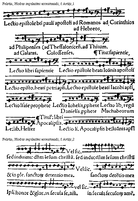 [Felstin, Modus regulariter accentuandi, f.Aviijv,3; text: Beati qui audiunt verbum dei et cultodiunt illud. Vel sic: verbum dei et custodiunt illud, Et reuersa est in domum suam. Iesus autem abscondit se et exiuit de templo. Plenum gratia et veritate.]