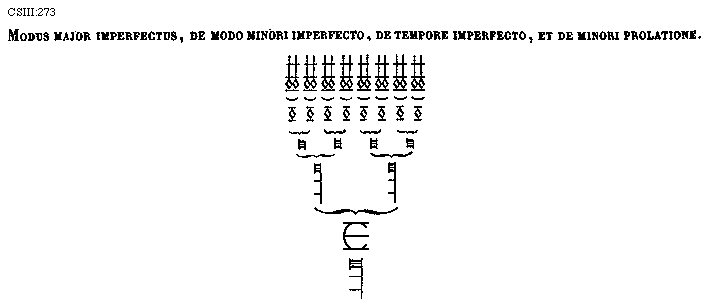 [273][CSIII:273; text: Modus major imperfectus, de modo minori imperfecto, de tempore imperfecto, et de minori prolatione.]