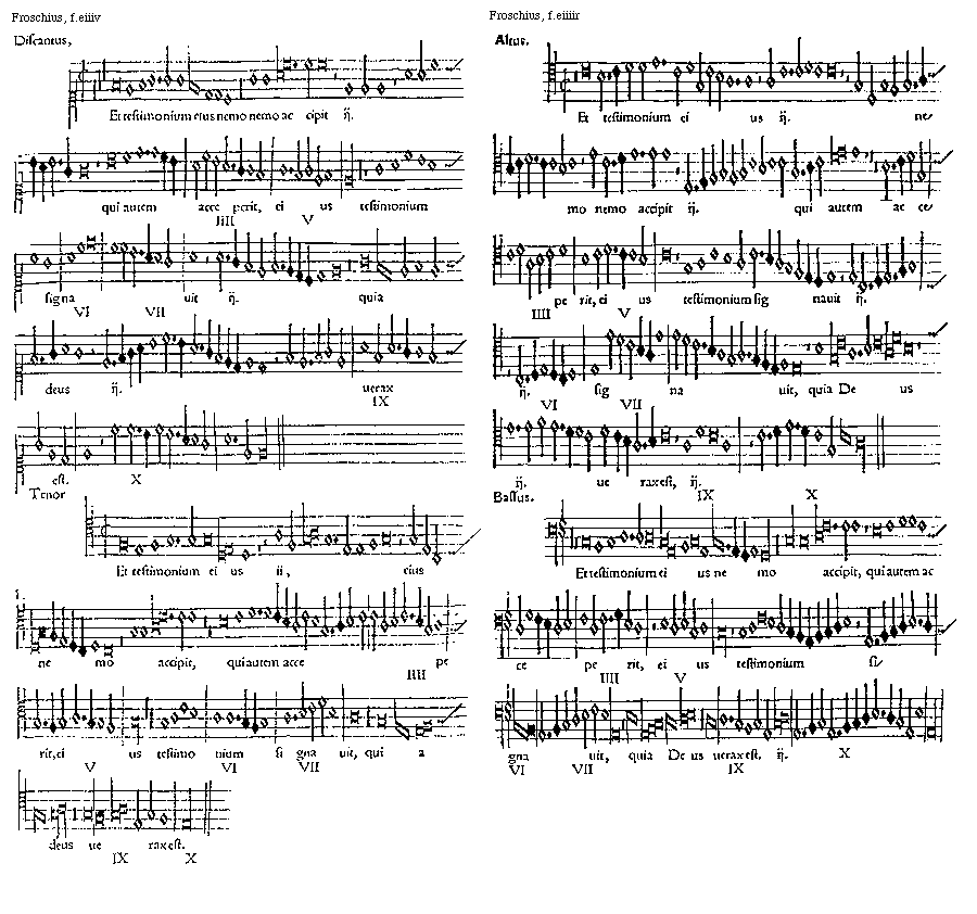[Froschius, f.eiiiv; text: Discantus, Et testimonium eius nemo accipit qui autem acceperit, eius testimonium signauit quia deus uerax est ij. IIII, V, VI, VII, IX, X, Tenor.]