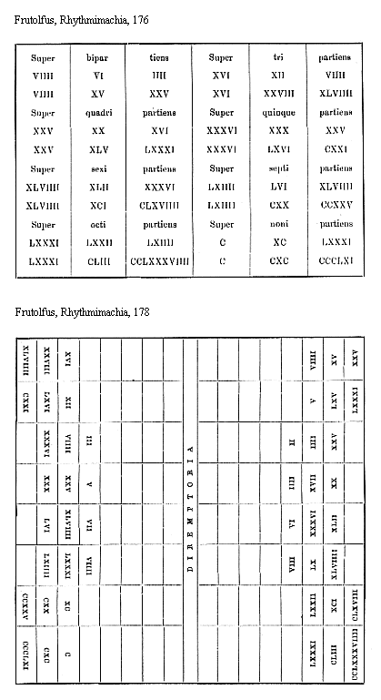 [188]hec praecepta inueniri, sed hos tantum maluimus ponere, ex quibus illi procreantur termini, qui in rithmimachiae tabula uidentur dispositi.