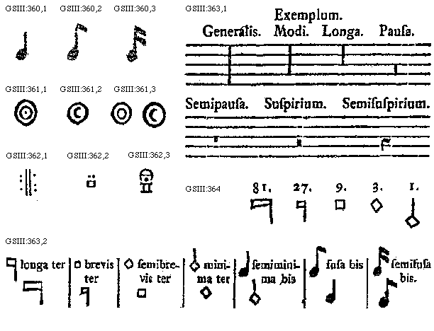 [GSIII:363,2; text: longa ter, brevis ter, semibrevis ter, minima ter, semiminima bis, fusa bis, semifusa bis.]