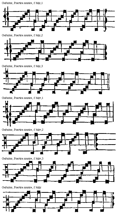 [Gafurius, Practica musice, f.bviv,2; text: Gloria patri et filio et spiritui sancto.]