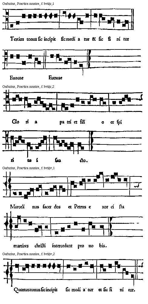 [f.bviijr]Euoaue autem tertij toni incipitur in Csolfaut scilicet in sextam supra finalem antiphonae secundum Gregorianos vbi tetrachordum in principio psalmodiae sumptum terminatur. [Gregoriani. Ambrosiani. in marg.] Ambrosiani autem suauibus procedentes principium Euouae huius tertij toni in quintam supra finalem antiphonae chordam in qua scilicet sua diapentes figura terminatur tamquam harmonica medietate suauiorem: sicuti in reliquos autenticis disposuere. Incipitur vero Gregoriana huiusmodi psalmodia in tertiam supra finem antiphonae: procedens his notulis vt re fa: cuius mediatio et terminationes hoc describuntur harmento. [Gafurius, Practica musice, f.bviijr,1; text: Tertius tonus sic incipit sic mediatur et sic finitur, Euouae.]