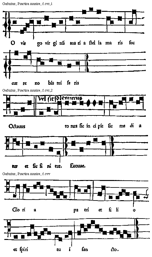 [Gafurius, Practica musice, f.cvr,1; text: O virgo virginum maria stella maris succurre nobis miseris.]