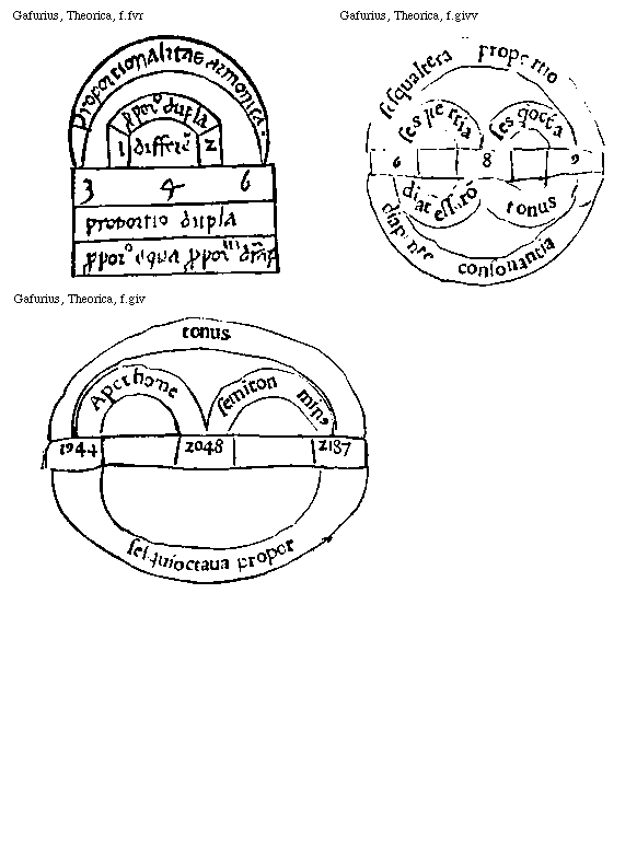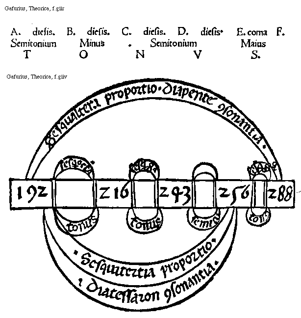 [Gafurius, Theorica, f.giir; text: A. diesis. B. C. D. E. coma, F. Semitonium Minus, Semitonium Maius, TONUS.]