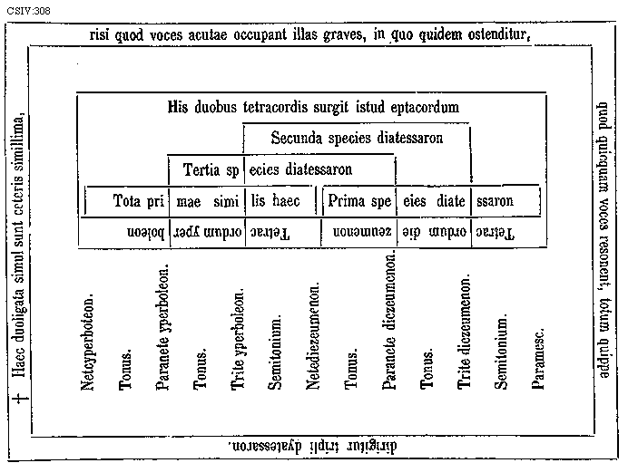 [CSIV:308; text: * Haec duoligata simul sunt ceteris simillima, risi quod voces acutae occupant illas graves, in quo quidem ostenditur, quod quicquam voces resonent, totum quippe dirigitur tripli dyatessaron. His duobus tetracordis surgit istud eptacordum, Secunda species diatessaron, Tertia species diatessaron, Tota primae similis haec, Prima speeies diatessaron, Tetracordum diezeumenon, Tetracordum yperboleon, Netcyperboteon. Tonus. Paranete yperboleon. Trite yperboleon. Semitonium. Netediezeumenon. Paranete diezeumenon. Trite diezeumenon. Paramese.]