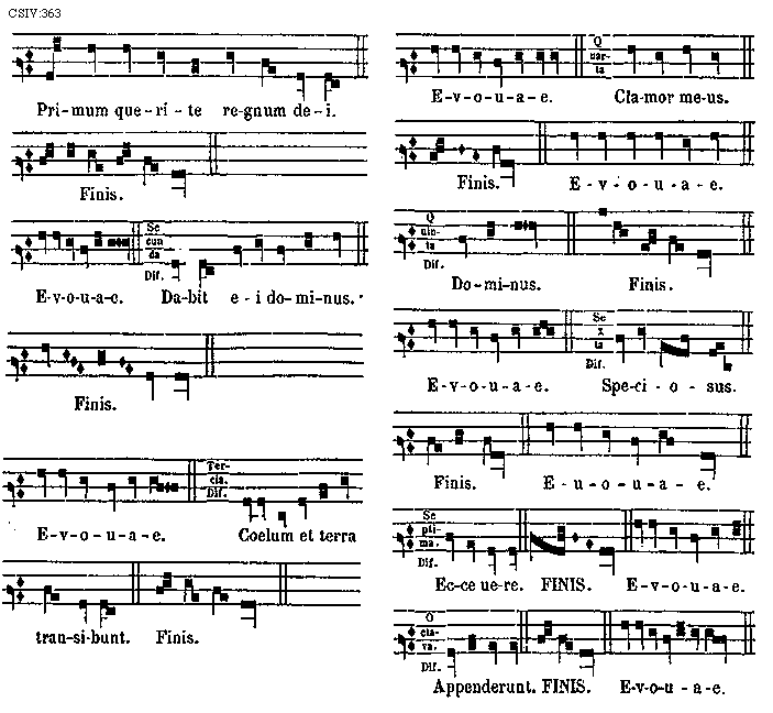 [CSIV:367; text: Dominus regit (me). Finis. Evouae. Secunda. Differentia. Sicut mirra electa. Finis. Evouae. Tercia. Differentia, Factus sum. Finis. Evouae.]