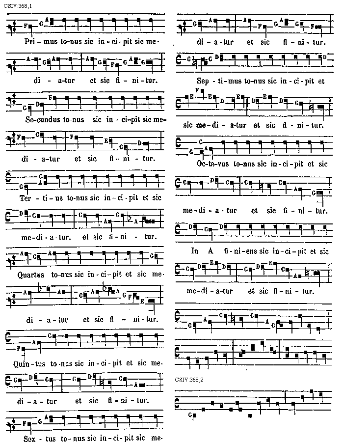 [368][CSIV:368,1; text: Primus tonus sic incipit sic mediatur et sic finitur. Secundus tonus sic incipit sic mediatur et sic finitur. Tertius tonus sic incipit et sic mediatur. et sic finitur. Quartus tonus sic incipit et sic mediatur et sic finitur. Quintus tonus sic incipit et sic mediatur et sic finitur. Sextus tonus sic incipit sic mediatur et sic finitur. Septimus tonus sic incipit et sic mediatur et sic finitur. Octavus tonus sic incipit et sic mediatur et sic finitur. In A finiens sic incipit et sic mediatur et sic finitur. F G A A G A A G F G A G C D F F G F E C D G A C D C C A C b A A G A G A b A G A b A G F E F A C C D C C D [sqb] C A F G A G A A F G A G F C [sqb] C D D E F E D E D E D C [sqb] G C A C D C C [sqb] C A G D C D C D E D C D E C A [sqb] G A C [sqb] C A G]