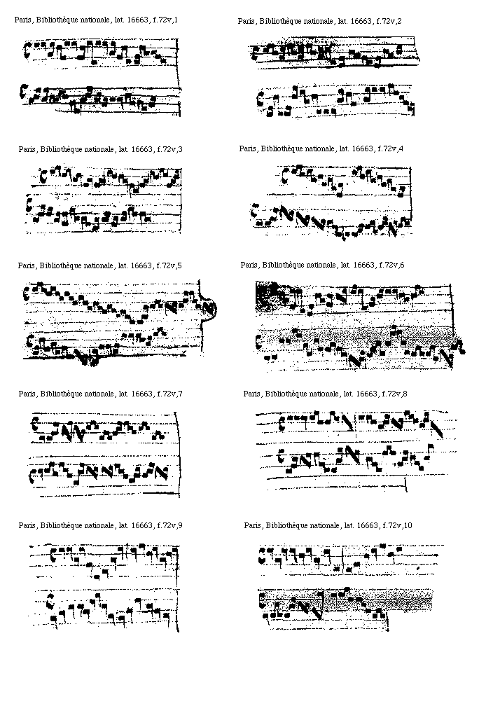 [f.72r]fit inpari: debet concordari [cum add. supra lin.] omni illo: quod fit in inpari. si sit in primo uel secundo uel tercio modo. S [Si corr. supra lin.] duo puncti sumentur hic pro uno et aliquando unus eorum ponitur in discordancia: propter colorem musice. E hic primus siue secundus et hic bene permittitur ab auctoribus prius et licenciatur hoc autem inuenitur in organo: in pluribus locis et precipue in motellis. Et notandum: quod sunt tres species discantus. Aut rectus positus contra rectum quod est prima species aut modo per ultra mensuram ad modum per ultra mensuram quod est secunda species: aut rectus contra per ultra mensuram quod est tercia species. Rectus ad rectum: sumitur dupliciter aut eodem ordine: aut ordine conuerso. Rectus ad rectum: dupliciter. aut rectus ad se ipsum: aut ad reliqum. Rectus ad se ipsum: potest combinari tripliciter secundum quod triplex est modus rectus. aut primis contra primum: ut hic patet.