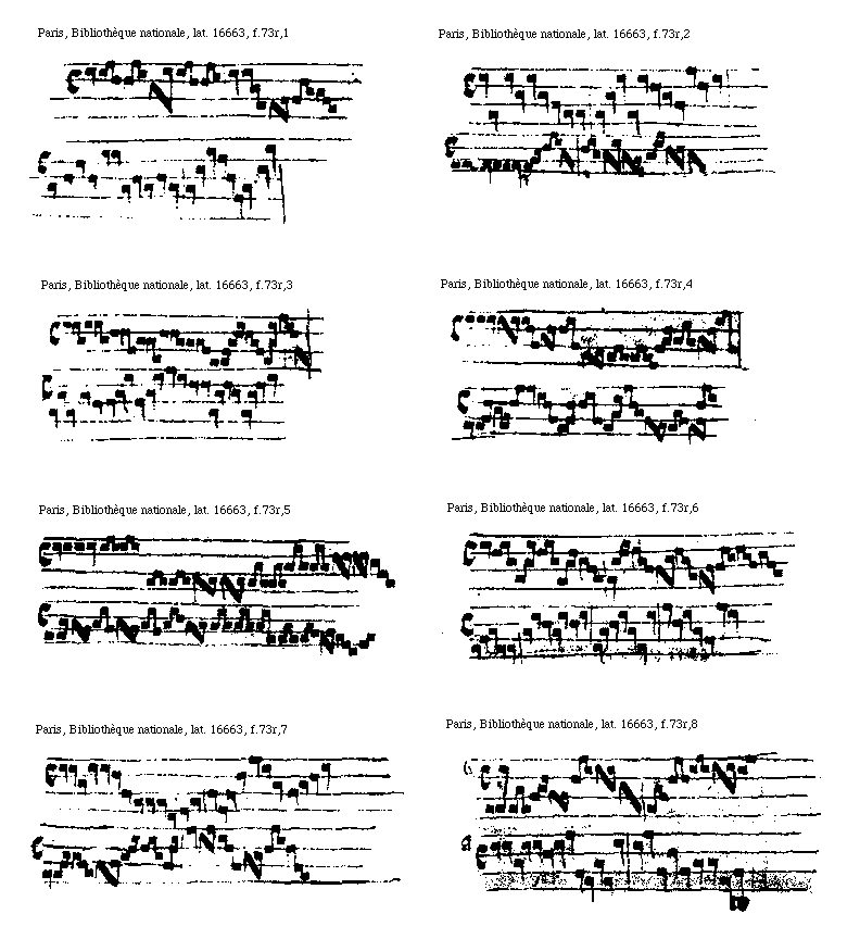 [f.75r]alicuius recte que longe et breues recte sumuntur debito modo: primo et principaliter. In non recta uero: sumitur longa et breuis non primo modo sed ex contingenti. Organum autem non rectum dicitur quicquid profertur per non rectam mensuram ut [aut ante corr.] dictum est superius. Et eius equippolencia: tantum se tenet in unissono usque ad finem alicuius [[p]] puncti ut secum conuenit secundum aliquam concordanciam. Et hoc sufficit de organo. quantum ad discantum. Longe et breues in organo tali modo dinoscuntur scilicet per consonanciam. per figuram per penultimam unde regula. Omne id quod accidit in aliquo secundum uirtutem consonanciarum: dicitur longum. alia regula quicquid figuratur longum secundum organa ante pausacionem uel loco consonancie: dicitur longum. alia regula Quicquid accipitur ante longam pausacionem uel ante perfectam concordanciam: dicitur esse longum. Sequitur de triplicibus. Triplum est: commixcio trium sonorum: secundum habitudinem sex concordanciarum scilicet unissonus diapason: et cetera. et hoc in eodem tempore. Et ista est: [[tonius]] [communis corr. in marg.] descipcio [descripcio corr. supra lin.]. Specialiter autem: sic describitur. Triplum est cantus proporcionatus aliquis: conueniens et concordans cum discantu. Et sic est tercius cantus. ad iunctus duobus unde prima regula. Triplum specialiter [spirituaaliter ante corr.] sumptum debet ex remoto [extremoto ante corr.] concordare: primo et secundo cantui nisi fuerit concordancia in simul per sonum reductum: quod sibi equipollet. Proprium est diapason: et infra. Remotum: est duplex diapason: et infra usque ad diapason. Remotissimum: est triplex diapason: et infra usque ad duplex diapason. Diapason dicitur dupla. diapente cum [[diapente]] diapason dicitur tripla: bis diapason quadrupla Diapente cum bis diapason sexcupla triplex diapason quod uix reperitur nisi instrumentis aflatu: dicitur octupla. Et ista probantur maxime per magnam figuram: musicalem. Multa in predictis dimisumus que partim continentur in triplicibus nunc prepositis et partim in quadruplicibus [quadrupplicibus ante corr.] post positis: primum est de errore. secundum de eorundem colore: tercium est: in posicione breuium: inpropriis locis. quartum est de nobilitate soni. quintum est: de dissonancia. ut sic concordancia. sextum est: de copulacione soni. Error tercii soni quando ordinamus sonos male conuenienstes: Quod per quatuor regulas cognoscimus. Quarum prima: talis est. Quociens ascendimus per tonos integros: et postea iungendo semitonium intonum [intonoum ante corr.] conuertitur et ultimus tonus in semitonium Quod fit. mediante synemenon ut patet in exemplo