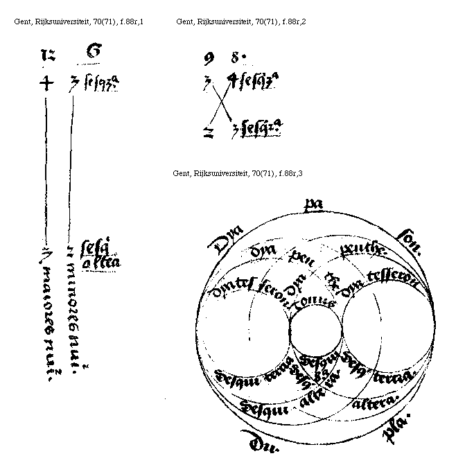 [f.91r]inter quos est tonus et inter 1944. et .2187. inter quos est tonus: et inter .1536. et 2048. inter quos est dyatesseron.