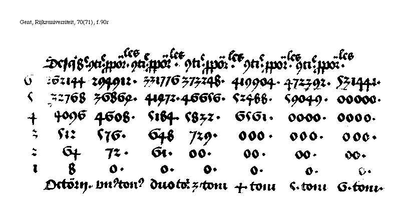 [Gent, Rijksuniversiteit, 70(71), f.90r; text: Sesquioctaue continue proportionales, Octonarij. unus tonus, duo toni, tres toni, quattuor toni, quinque toni, sex toni, 6, 5, 4, 3, 2, 1, 262144, 294912. 331776, 373248. 419904. 472392. 531441. 32768, 36864. 41472. 46656. 52488. 59049. 00000. 4096, 4608. 5184. 5832. 6561. 0000. 512, 576. 648, 729. 000. 64, 72. 61. 00. 8, 0.]