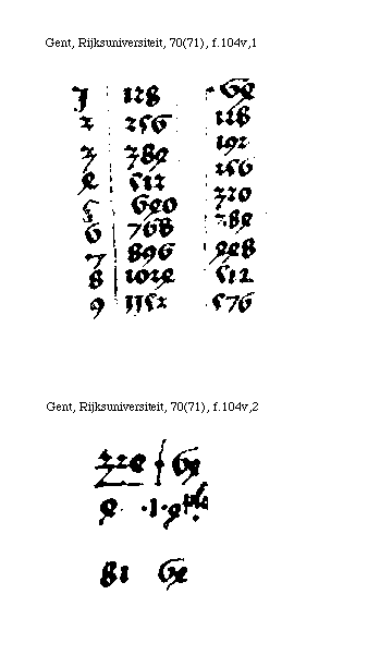 [F. in marg.] Alia proba secundum processum quem seruaui in deductione geometrica. Accipe ex ista tabula deductionis arismetrice totam cordam [Gamma] h. scilicet 10368. et illam diuide per .9. prima sui diuisione et ueniunt 1152. que .1152. extende nonies supra se et uidebis quod incipiendo a capitello H. uacat primus punctus huius diuisionis sed in secundo habes aa. In .tercio .d. In .quarto. a uacat quintus. In sexto d. uacat septimus. In .octauo A. In .nono .[Gamma]. Secundo ex eadem tabula accipe cordam A h. scilicet 9216. et illa diuide per 9. et ueniunt .1024. que 1024. extende nonies supra se: et uidebis. quod incipiendo a capitello H. uacat primus punctus huius diuisionis: sed in secundo habes [sqb][sqb]. In tercio e. In quarto [sqb] in acutis. Quintus uacat. In sexto E. Septimus uacat In octauo [sqb] in grauibus In. nono .A. Tercio accipe ex eadem tabella totam cordam [Gamma] h. scilicet .10368. et illam diuide per 4. et ueniunt .2592. que extende quater supra se et uidebis: quod incipiendo a capitello H. in primo puncto huius diuisionis habes g. in secundo .G. grauem In tercio C grauem et in quarto [Gamma]. Quarto accipe ex eadem tabula cordam C h. scilicet 7776. et illam diuide per .4 et ueniunt 1944. que extende quater supra se et uidebis. quod incipiendo a capitello h. in primo puncto huius diuisionis habes cc. In secundo c. In tercio F. In quarto C grauem. Quinto accipe ex eadem tabella cordam d h. scilicet 6912. et illam diuide per .4. et ueniunt 1728. que extende quater supra se et uidebis quod incipiendo a capitello H. in primo puncto huius diuisionis habes dd. In secundo d. In tercio G et in quarto D. Sexto accipe ex eadem tabella cordam E h. scilicet 6144. et illam diuide per 4. et ueniunt 1536. que extende quater supra se et uidebis. quod incipiendo a capitello H. in primo puncto huius diuisionis habes ee. In secundo e In tercio a. et in quarto E. grauem. Septimo accipe ex eadem tabella cordam F h. scilicet 5832. et illam diuide per .4. et ueniunt 1458. que extende quater supra se: et uidebis quod incipiendo a capitello H. uacat primus punctus huius diuisionis et in secundo habes F. et in tercio habes b molle in acutis et in quarto F grauem. Octauo et ultimo