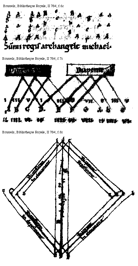 [Brussels, Bibliothèque Royale, II 784, f.6r; text: aa, [sqb][sqb], cc, a, [sqb], c, g, A, B, C, [Gamma], G, Summi regis archangele Michael.]