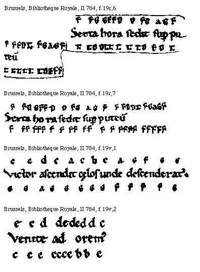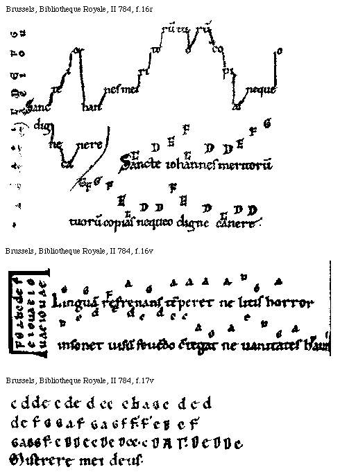 [Brussels, Bibliothèque Royale, II 784, f.14v; text: g, f, ga, a, Ad te leuaui.]