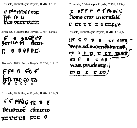 [Brussels, Bibliothèque Royale, II 784, f.19r,5; text: Veni ad docendum nos uiam prudentiae. C, F, E, D, B, A, [Gamma]]