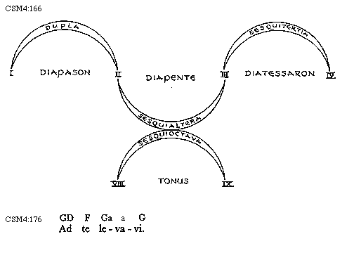 [CSM4:198; text: Diapente, Diapason, Diatessaron, [Gamma], A, B, C, D, E, F, G, a, [sqb], c, d, e, Miserere mei Deus]