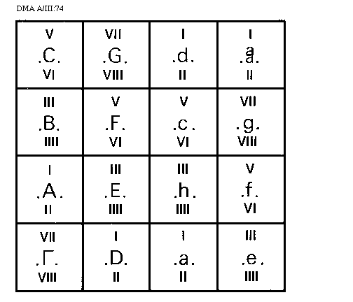 [74][DMA A/III:74; text: .C., .G., .d., .aa., .B., .F., .c., .g., .A., .E., .h., .f., .Gamma., .D., .a., .e., I, II, III, IIII, V, VI, VII, VIII]