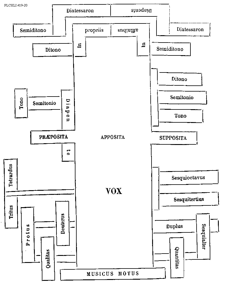[PLCXLI:419-20; text: Semiditono, Diatessaron, Diapente, Ditono, In propriis, In affinibus, Semiditono, Tono, Semitonio, Praeposita, Apposita, Supposita, Vox, Tritus, Tetrardus, Sesquioctavus, Sesquitertius, Protus, Deuterus, Duplus, Sesquialter, Quantitas, Qualitas, Musicus motus]