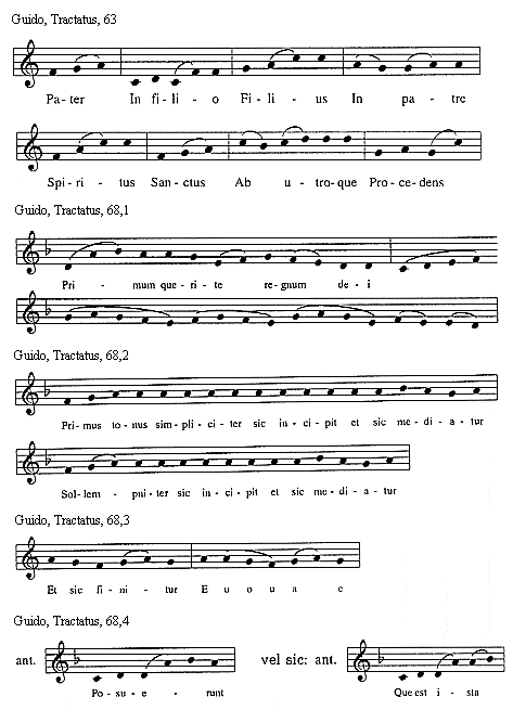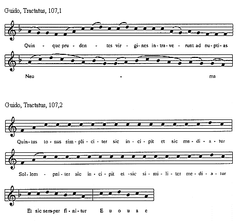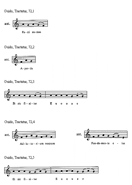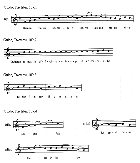 [Guido, Tractatus, 107,2; text: Quintus tonus simpliciter sic incipit et sic mediatur, Sollempniter sic incipit et sic similiter mediatur, Et sic semper finitur, Euouae]