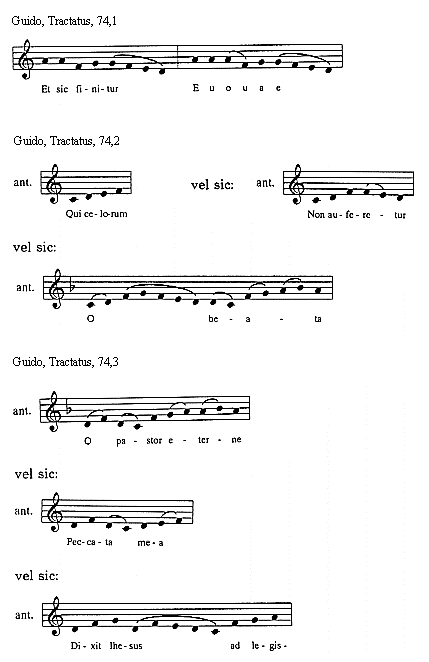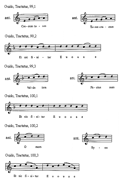 [Guido, Tractatus, 114,3; text: Sextus tonus in officiis sic incipit et sic mediatur, Et sic semper finitur, Euouae]
