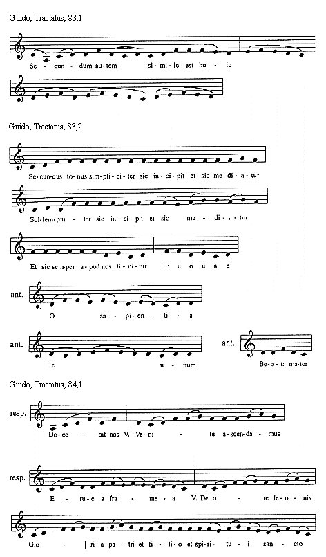 [Guido, Tractatus, 112,2; text: Sextus tonus simpliciter sic incipit et sic mediatur, Sollempniter sic incipit et sic eodem modo mediatur, Et sic semper finitur, Euouae, antiphona, O quam metuendus est, Ave regina celorum]