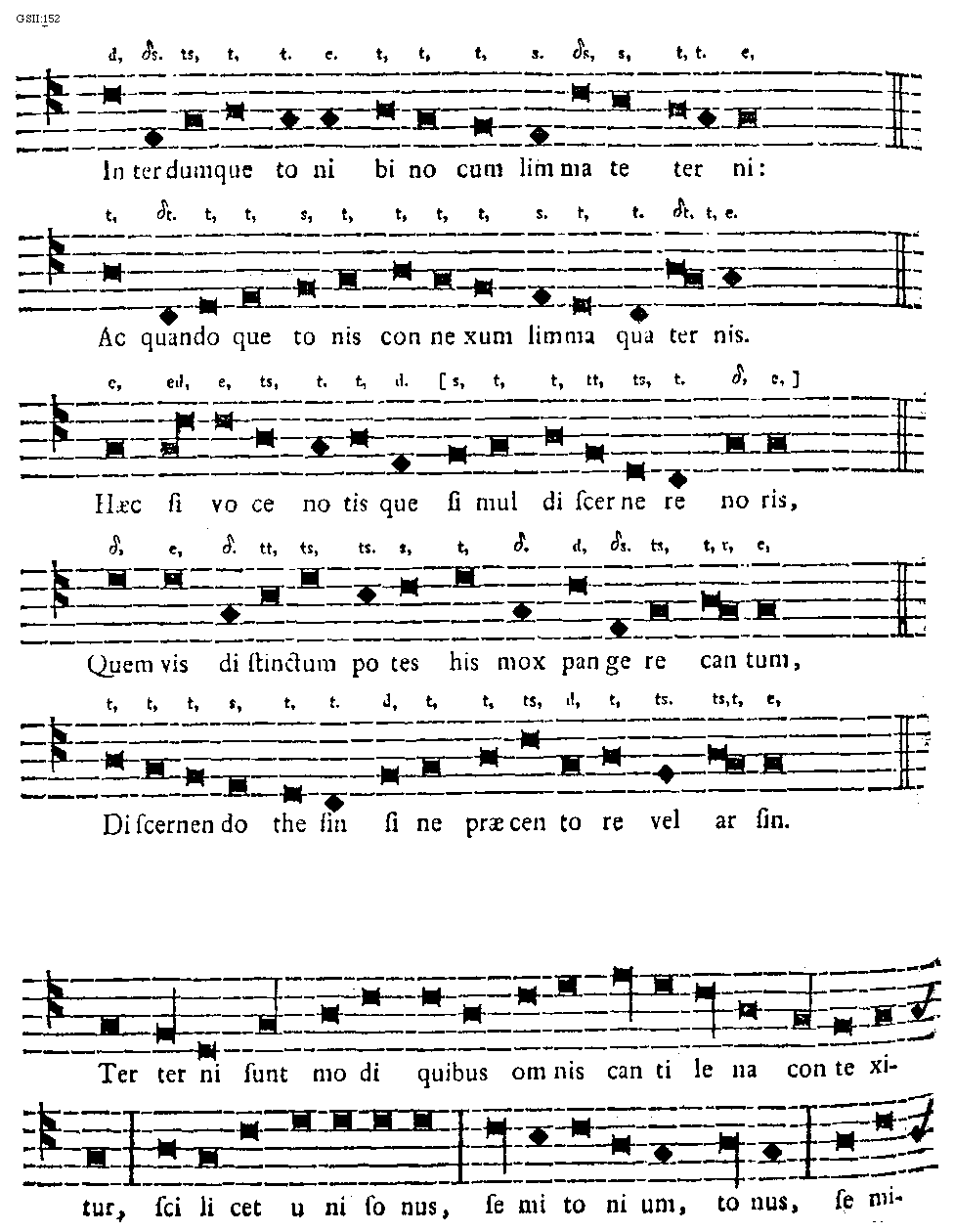 [152][GSII:152; text: Interdumque toni bino cum limmate terni: Ac quandoque tonis connexum limma quaternis. Haec si voce notisque simul discernere noris, Quemvis distinctum potes his mox pangere cantum, Discernendo thesin sine praecentore vel arsin. Ter terni sunt modi quibus omnis cantilena contexitur, scilicet unisonus, semitonium, tonus, semi-, d, [Delta]s. ts, t, e. [Delta]t. ed, tt,]