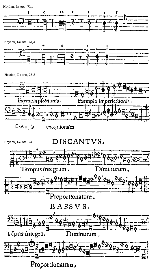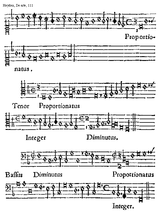 [69][Heyden, De arte, 69; text: TENOR. Integra Prolatio. Dtminuta Prolatio. Proportionata Prolatio. BASSVS, Diminuta Prolatio.]