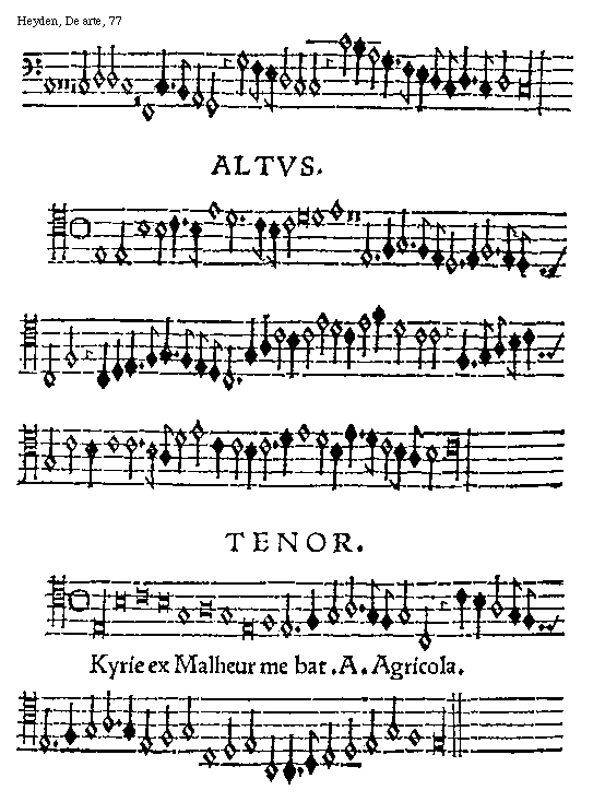 [Heyden, De arte, 150; text: DISCANTVS. Agnus. Malhuer me bat. Alexander Agricola, BASSVS]