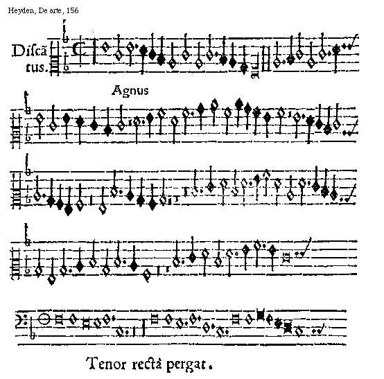 [Heyden, De arte, 156; text: Discantus. Agnus, Tenor recta pergat.]
