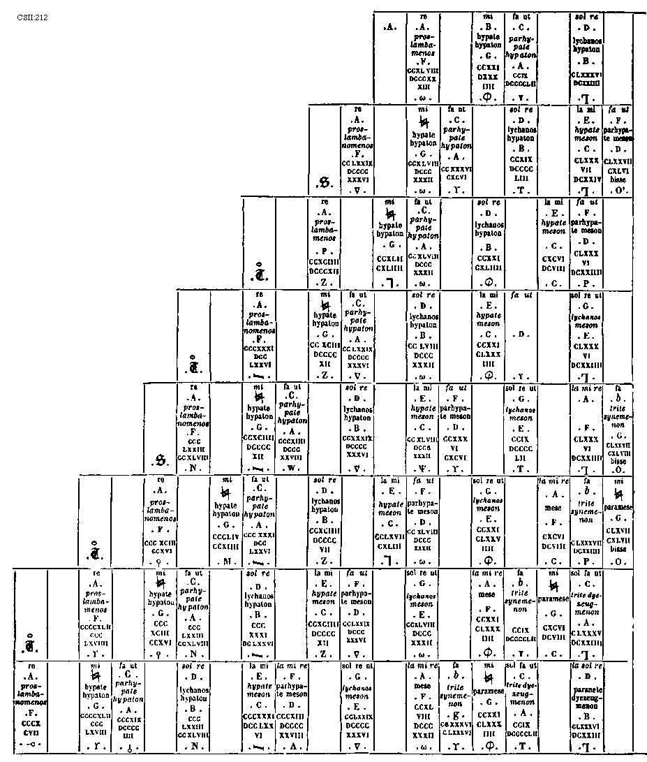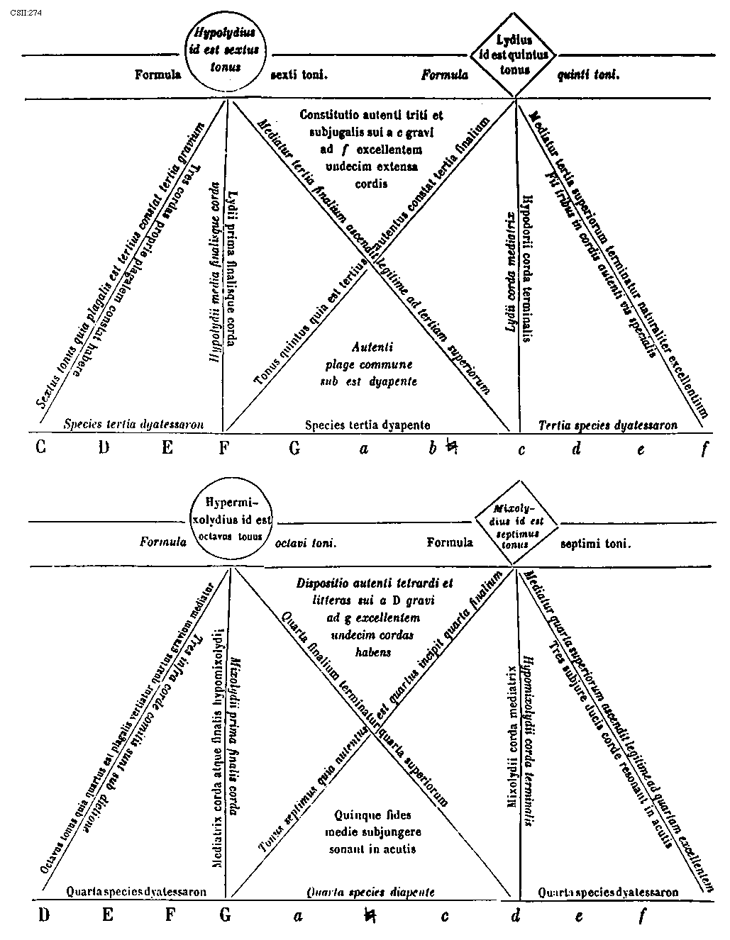 [274][CSII:274; text: Formula sexti toni. Hypolydius id est sextus tonus, Sextus tonus quia plagalis est tertius constat tertia gravium, Tres cordas proprie plagalem constat habere, Hypolydii media finalisque corda, Fit tribus in cordis autenti vis specialis, Lydii prima finalisque corda, Mediatur tertia finalium ascendit legitime ad tertiam superiorum, Formula quinti toni. Lydius id est quintus tonus, Tonus quintus quia est tertius autentus constat tertia finalium, Mediatur tertia superiorum terminatur naturaliter excellentium, Lydii corda mediatrix, Hypodorii corda terminalis, Constitutio autenti triti et subjugalis sui a c gravi ad f excellentem undecim extensa cordis, Autenti plage commune sub est dyapente, Species tertia dyatessaron, Species tertia dyapente, Tertia species dyatessaron, Formula octavi toni. Hypermixolydius id est octavus tonus, Octavus tonus quia quartus est plagalis vertiatur quartus gravium mediatur, Tres infra corde comitis sunt sub dictione, Mediatrix corda atque finalis hypomixolydii, Mixolydii prima finalis corda, Quarta finalium terminatur quarta superiorum, Formula septimi toni. Mixolydius id est septimus tonus, Tonus septimus quia autentus est quartus incipit quarta finalium, Mixolydii corda mediatrix, Hypomixolydii corda terminalis, Mediatur quarta superiorum ascendit legitime ad quartam excellentem, Tres subjure ducis corde resonant in acutis, Dispositio autenti tetrardi et litteras sui a D gravi ad g excellentem undecim cordas habens, Quinque fides medie subjungere sonant in acutis, Quarta species dyatessaron, Quarta species diapente, Quarta species dyatessaron, C, D, E, F, G, a, b, [sqb], c, d, e, f]