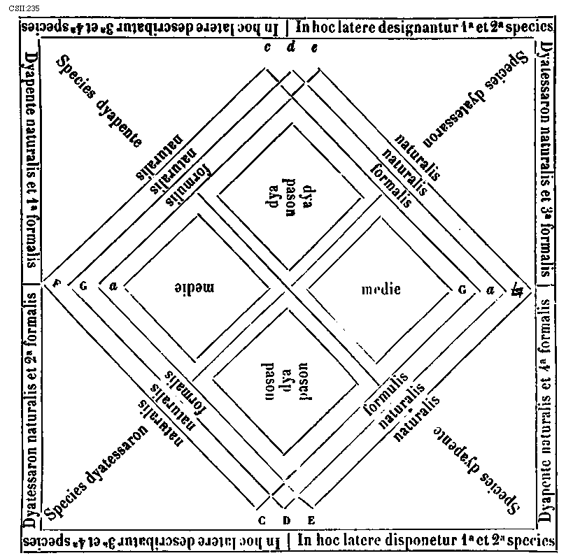 [272]monocordi dispositio continetur, tres sint cantus per [sqb] quadratum vel durum, per naturam et per b molle, qui ceteris minus stabilis, minus naturalis existens propter causas aliquas ceteris adjunctus est. Non decet autem ut cantus hic ceteros precedat in dicta monocordi dispositione, sed sequatur. Precederet autem, si inter A primam et B secundam vox media poneretur, et tunc non a [Gamma] sive gammaut scilicet ab F monocordum initium inciperet. Inde etiam proveniret ut in [Gamma] non esset sola vox similiter, nec in A, sed plures, essentque ibi vocum mutationes. Essent etiam in C tres voces, et mutationes sex similiter in D.