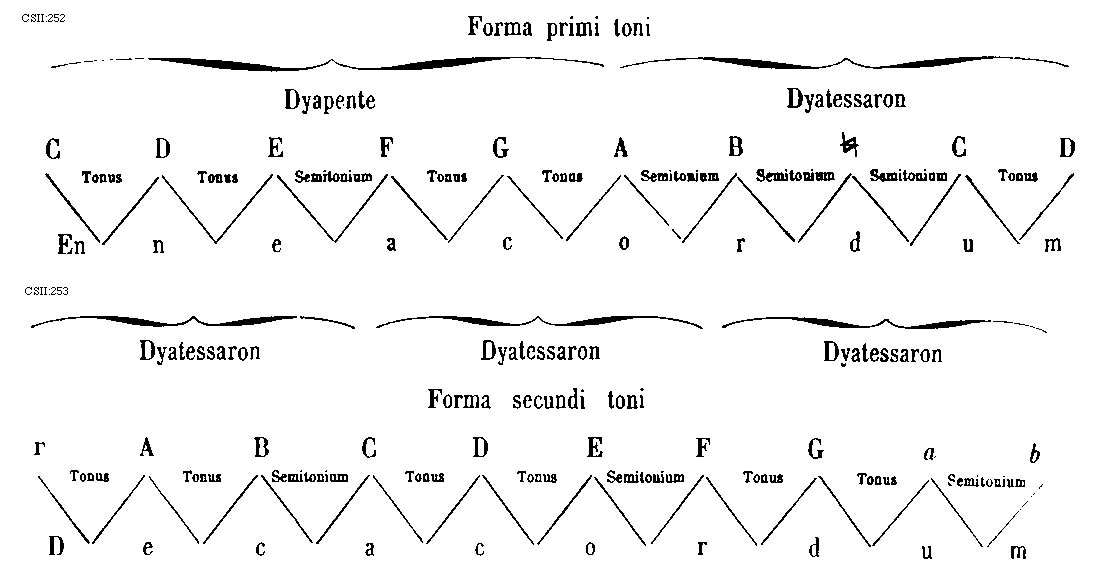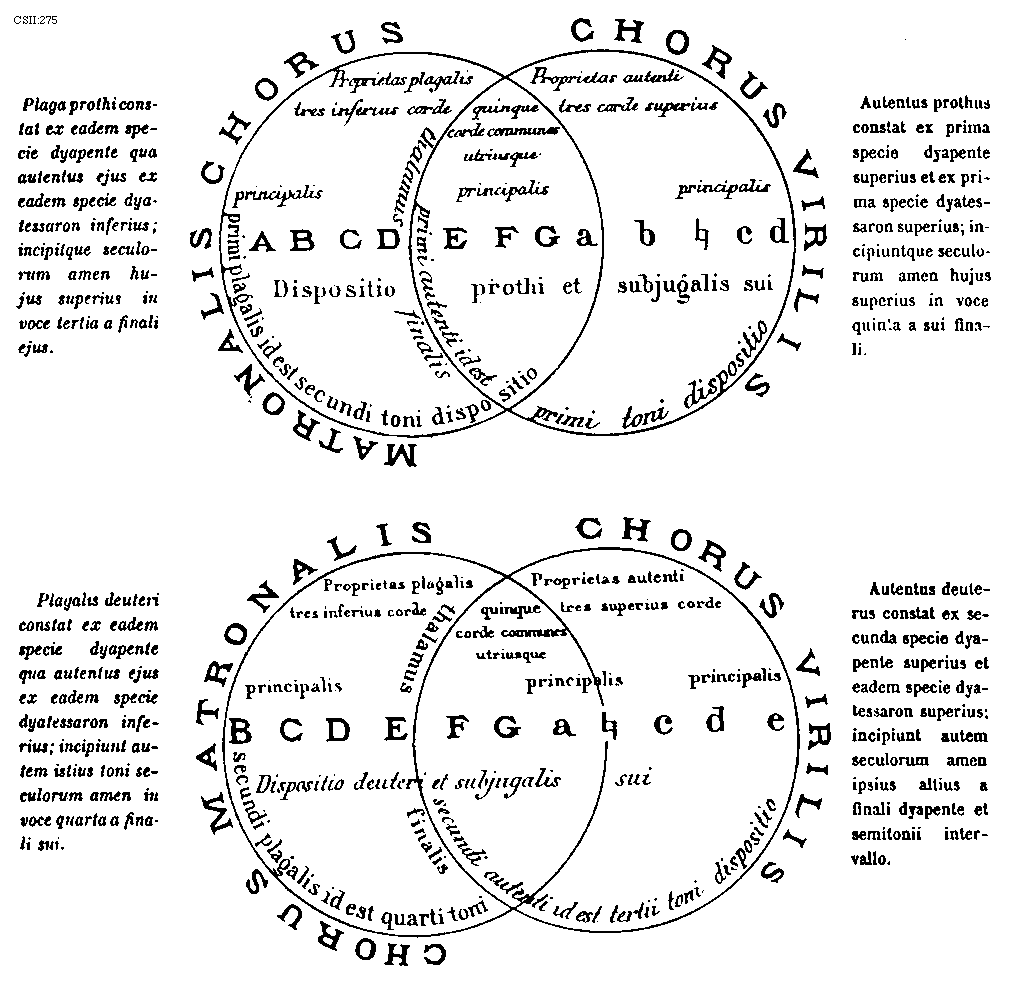 [CSII:275; text: Plaga prothi constat ex eadem specie dyapente qua autentus ejus ex eadem specie dyatessaron inferius; incipitque seculorum amen hujus superius in voce tertia a finali ejus. MATRONALIS CHORUS, CHORUS VIRILIS, Proprietas plagalis tres inferius corde, Proprietas autenti tres corde superius, quinque corde communes utriusque, principalis, Dispositio prothi et subjugalis sui, primi plagalis id est secundi toni dispositio, thalamus finalis, primi autenti id est primi toni dispositio, Authentus prothus constat ex prima specie dyapente superius et ex prima specie dyatessaron superius; incipiuntque seculorum amen hujus superius in voce quinta a sui finali. Plagalis deuteri constat ex eadem specie dyapente qua autentus ejus ex eadem specie dyatessaron inferius; incipiunt autem istius toni seculorum amen in voce quarta a finali sui. CHORUS MATRONALIS, CHORUS VIRILIS, Proprietas plagalis tres inferius corde, Proprietas autenti tres superius corde, quinque corde communes utriusque, principalis, Dispositio deuteri et subjugalis sui, secundi plagalis id est quarti toni, secundi autenti id est tertii toni dispositio, thalamus finalis, Autentus deuterus constat ex secunda specie dyapente superius et eadem specie dyatessaron superius; incipiunt autem seculorum amen ipsius altius a finali dyapente et semitonii intervallo. A, B, C, D, E, F, G, a, b, [sqb], c, d, e]