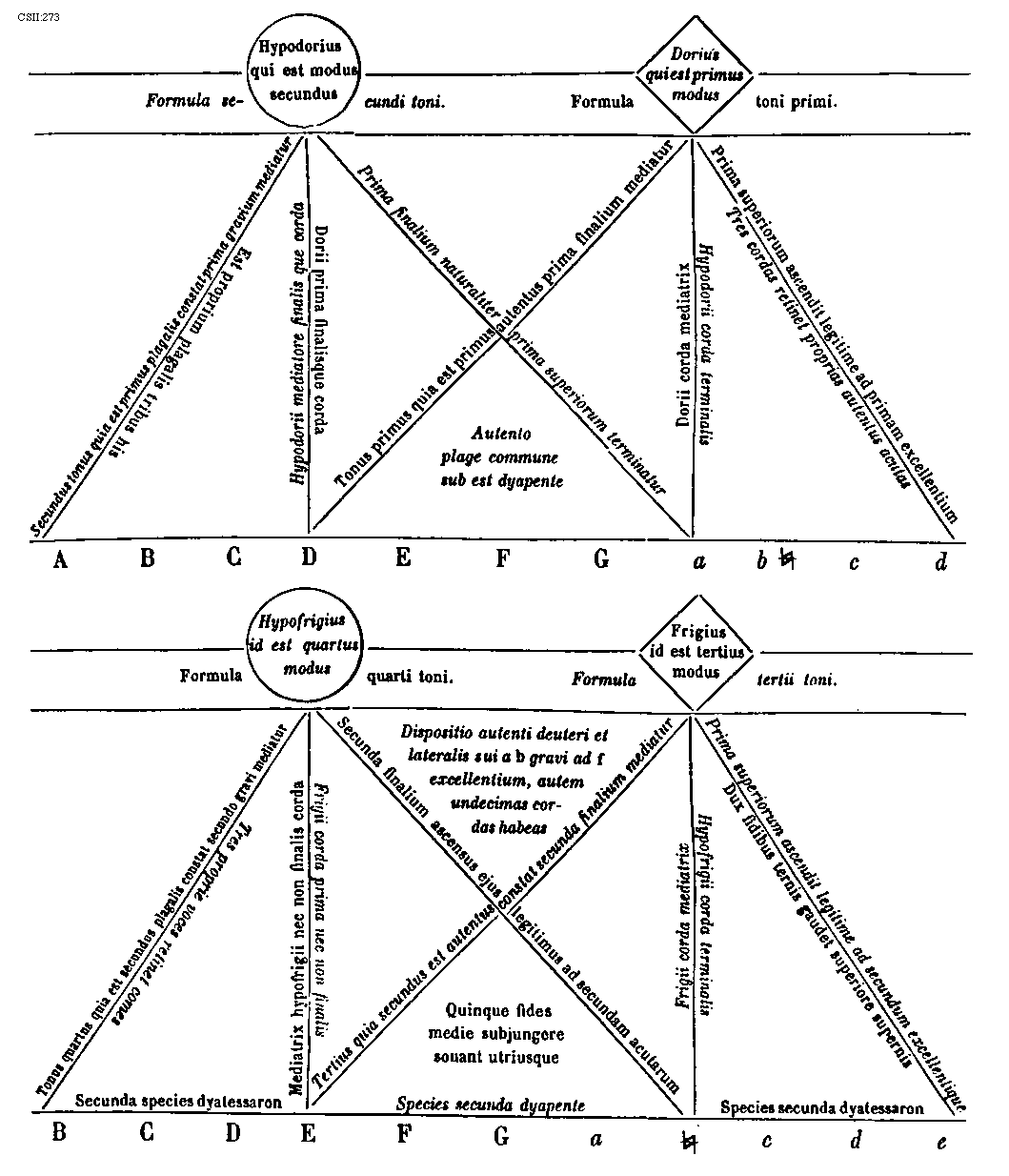 [CSII:273; text: Formula secundi toni. Hypodorius qui est modus secundus, Secundus tonus quia est primus plagalis constat prima gravium mediatur, Est proprium plagalis tribus his, Hypodorii mediatore finalis que corda, Dorii prima finalisque corda, Prima finalium naturaliter prima superiorum terminatur, Formula toni primi. Dorius qui est primus modus, Tonus primus quia est primus autentus prima finalium mediatur, Prima superiorum ascendit legitime ad primam excellentium, Tres cordas retinet proprias autentus acutas, Dorii corda mediatrix, Hypodorii corda terminalis, Autento plage commune sub est dyapente, Formula quarti toni. Hypofrigius id est quartus modus, Tonus quartus quia est secundus plagalis constat secundo gravi mediatur, Tres proprie voces retinet comes, Mediatrix hypofrigii nec non finalis corda, Frigii corda prima nec non finalis, Secunda finalium ascensus ejus legitimus ad secundam acutarum, Formula tertii toni. Tertius quia secundus est authentus constat secunda finalium mediatur, Frigius id est tertius modus, Frigii corda mediatrix, Hypofrigii corda terminalis, Prima superiorum ascendit legitime ad secundum excellentique, Dux fidibus ternis gaudet superiore supernis, Dispositio autenti deuteri et lateralis sui a b gravi ad f excellentium, autem undecimas cordas habeas, Quinque fides medie subjungere sonant utriusque, Secunda species dyatessaron, Species secunda dyapente, Species secunda dyatessaron, A, B, C, D, E, F, G, a, b, [sqb], c, d, e]