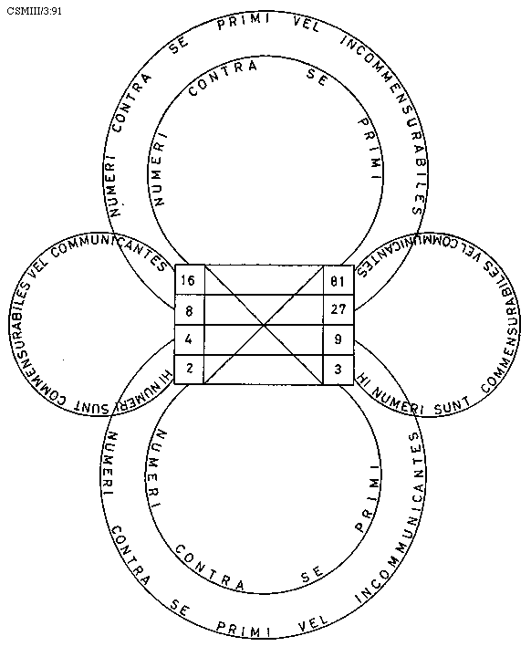 [91][CSMIII/3:91; text: Numeri contra se primi vel incommensurabiles, Numeri contra se primi; Hi numeri sunt commensurabiles vel communicantes, 16, 8, 4, 2, 81, 27, 9, 3, Numeri contra se primi vel incommunicantes]