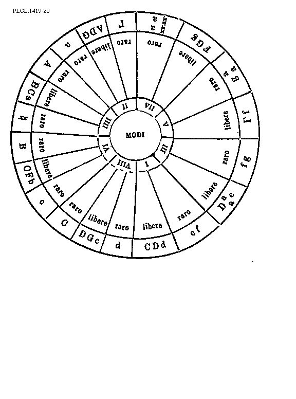[PLCL:1419-20; text: [Gamma], A, B, C, D, E, F, G, a, b, [sqb], c, d, e, f, g, aa, [sqb][sqb], raro, libere, Modi, I, II, III, IIII, V, VI, VII, VIII]
