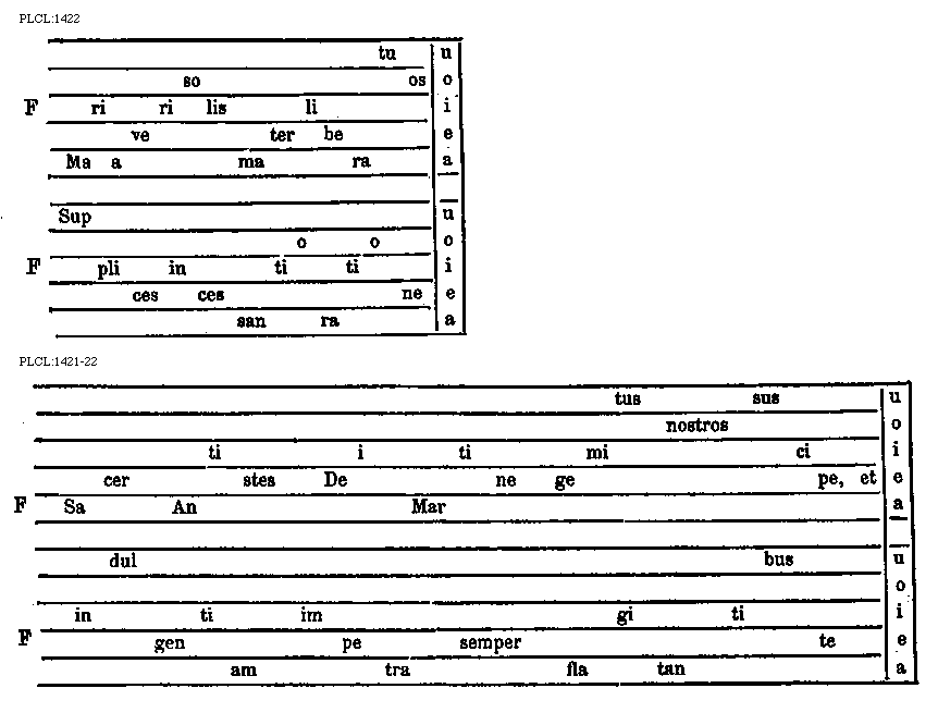 [PLCL:1421-22; text: F, Sacer Antistes Dei Martine gemitus nostros suscipe, et, indulgentiam impetra semper flagitantibus te, u, o, i, e, a]